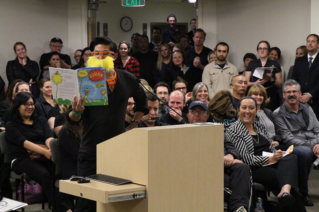 The Lorax, played by District Educators Association (DEA) member and high school Special Education teacher Jeff Lam, gave a well-received oratory at the Huntington Beach Union High School District (HBUHSD) Board meeting on Tuesday March 8. Delivered in “Loraxian Rhyme” he urged the school board to share its economic bounty evenly among all interest groups. The message was reinforced by 44 teachers who also took their turns at the microphone to urge a fair settlement.